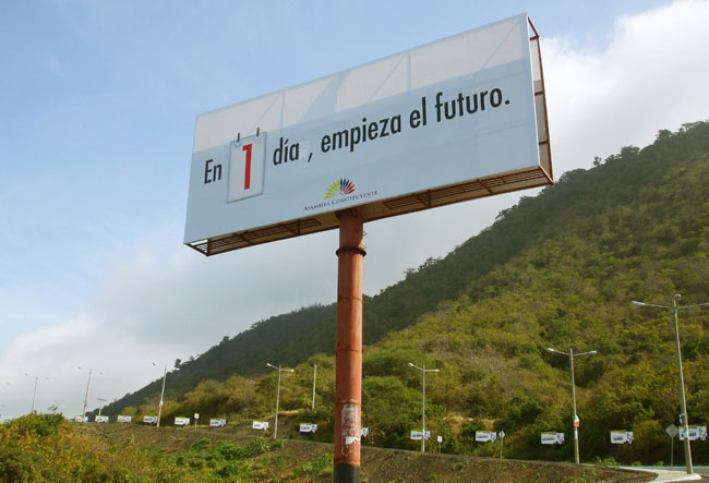 “En 1 día empieza el futuro”, dice la mega vaya que en cuenta regresiva le recuerda a los/as visitantes de Ciudad Alfaro que el trabjo de la Asamblea Nacional Constituyente (ANC) llega a su fin.
